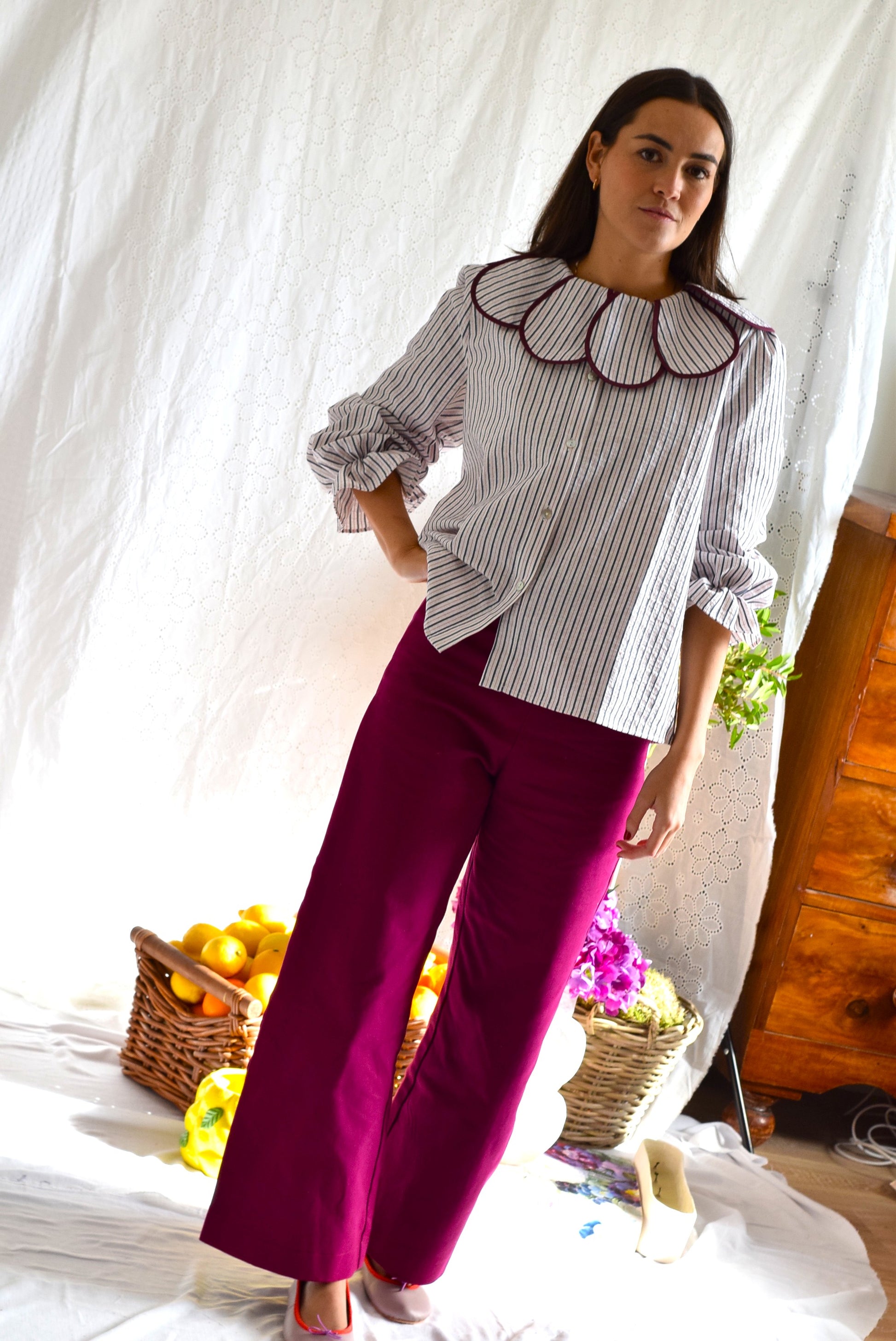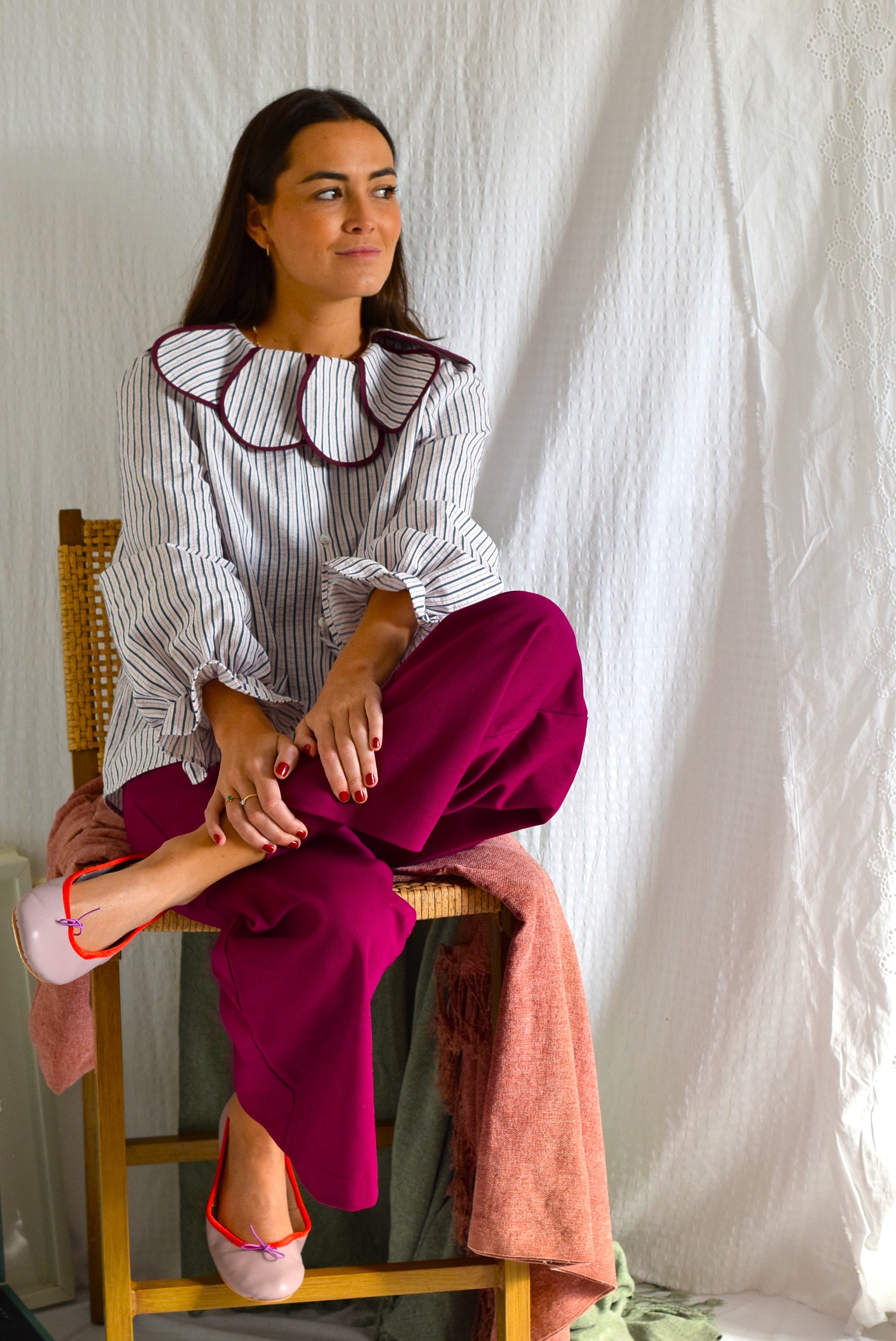 Blusa con cuello haciendo ondas cerradas en otro tejido. Una blusa única y muy especial que lucirás todo el otoño con y sin jersey.