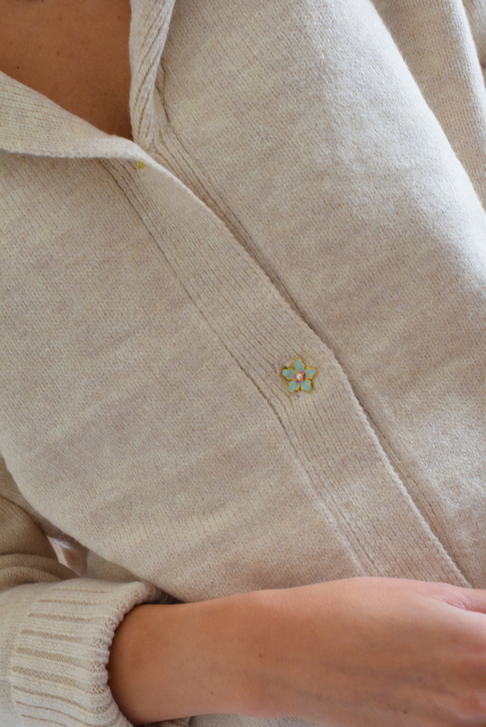 Chaqueta de cuello en pico cayendo por detrás. Botones joya en forma de flor.