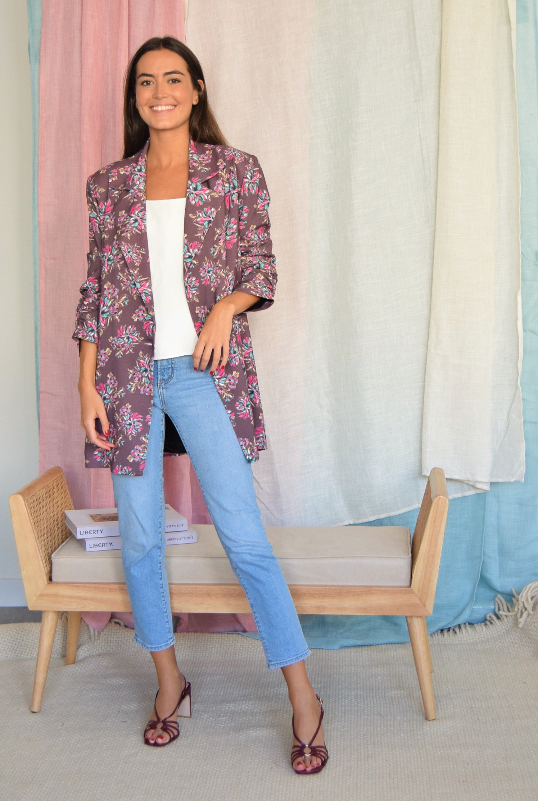 Chaqueta de vestir tipo blazer. Puño con frunce. Tejido de estampado de flores.