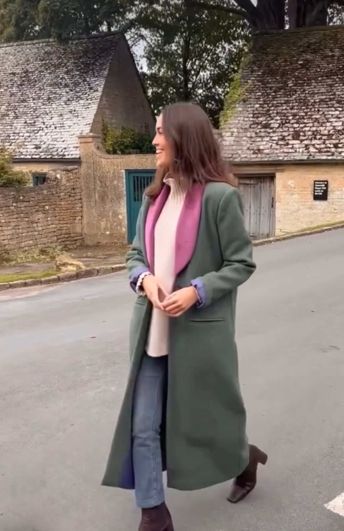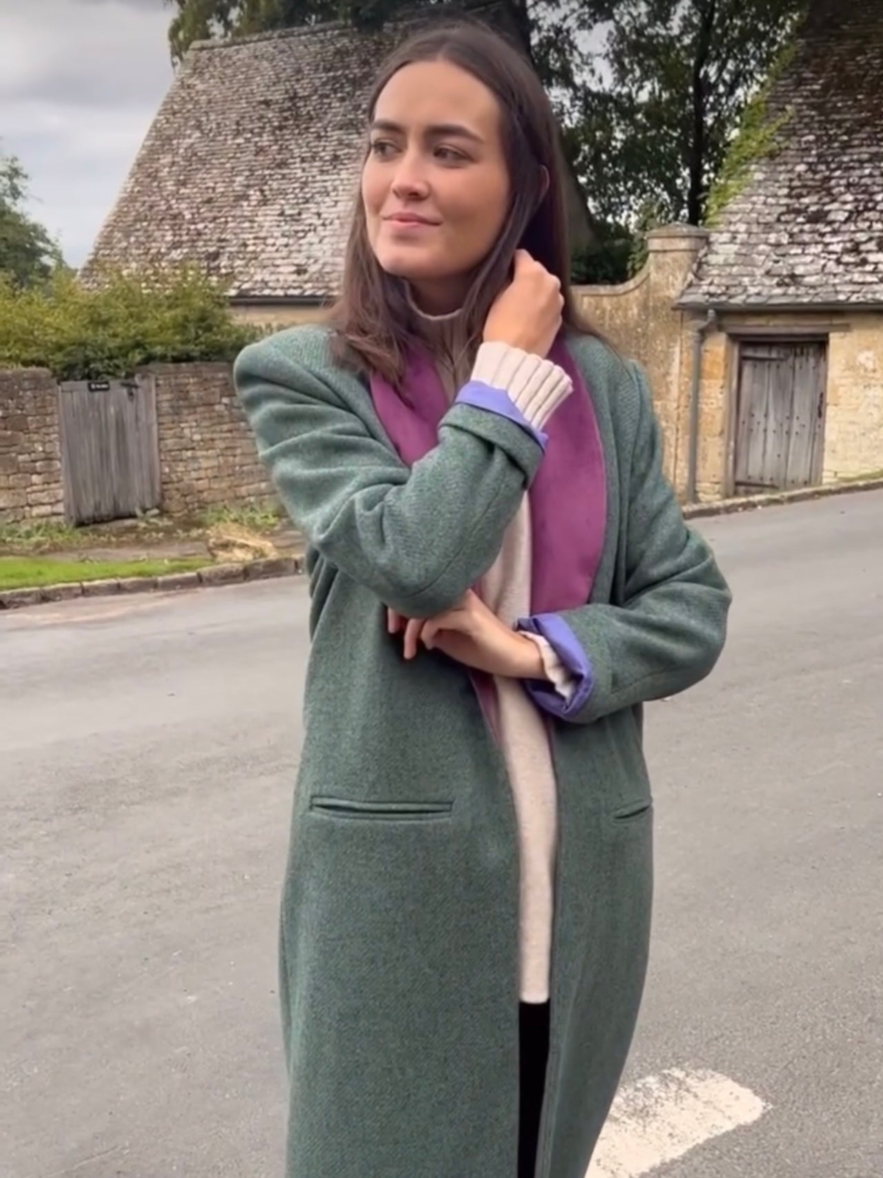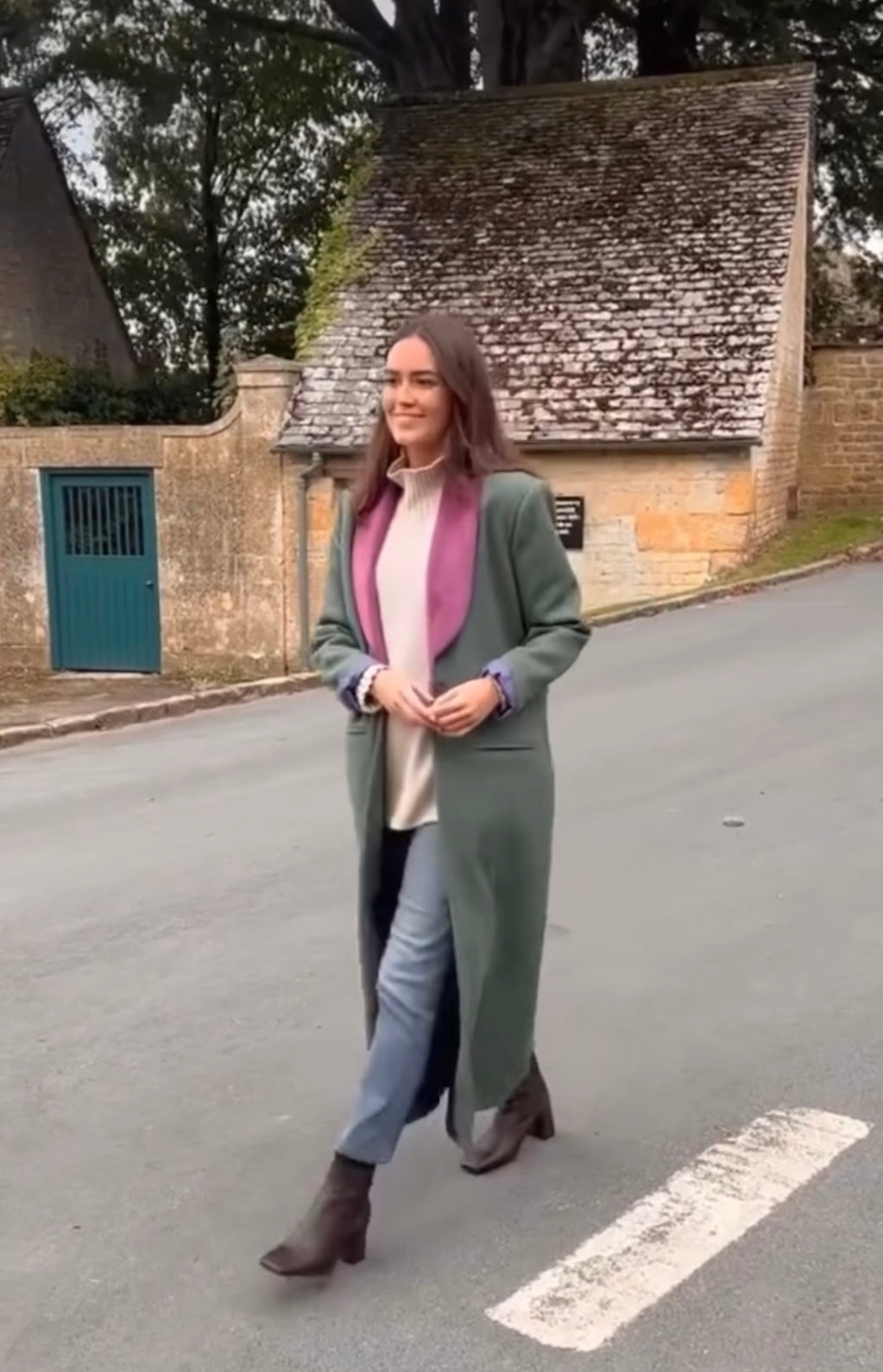 Abrigo de corte recto y largo con solapas haciendo contraste y un solo botón.