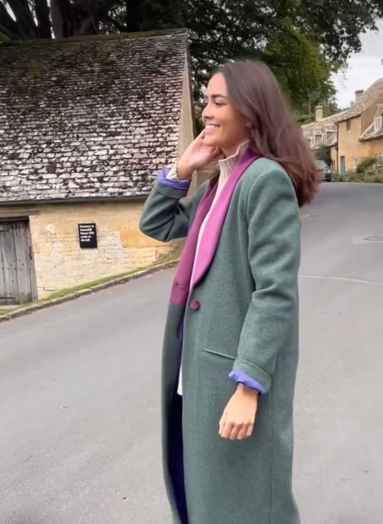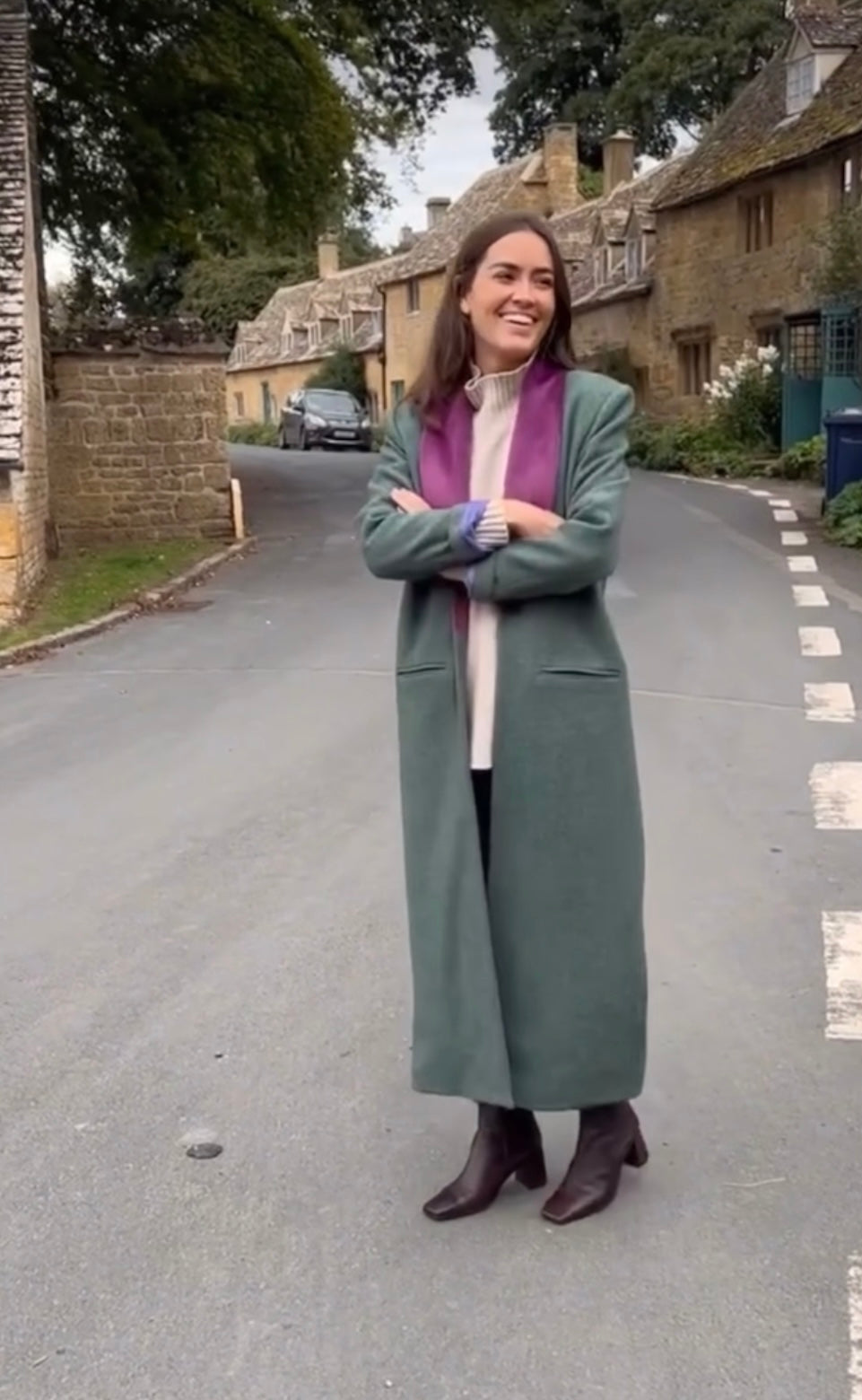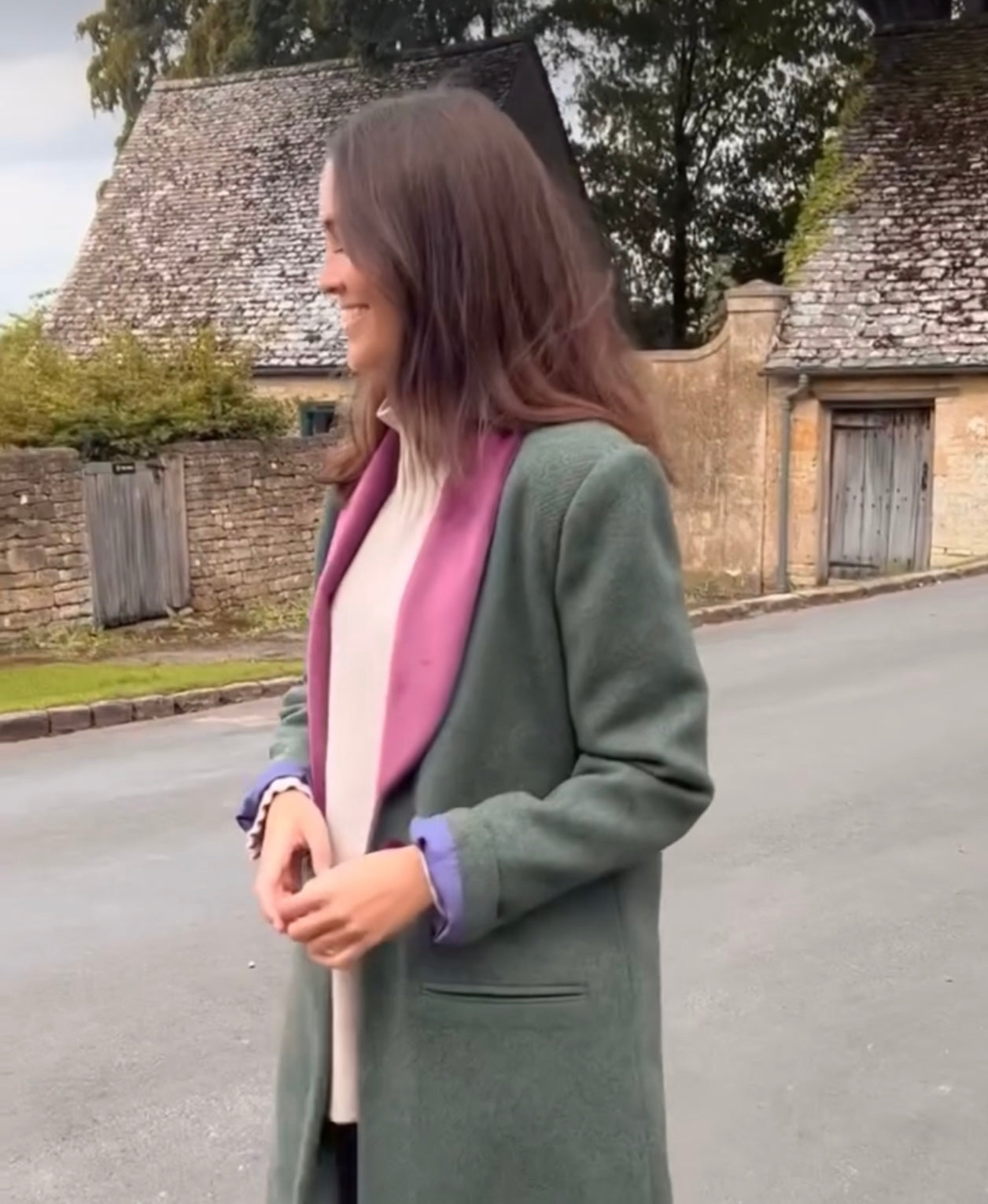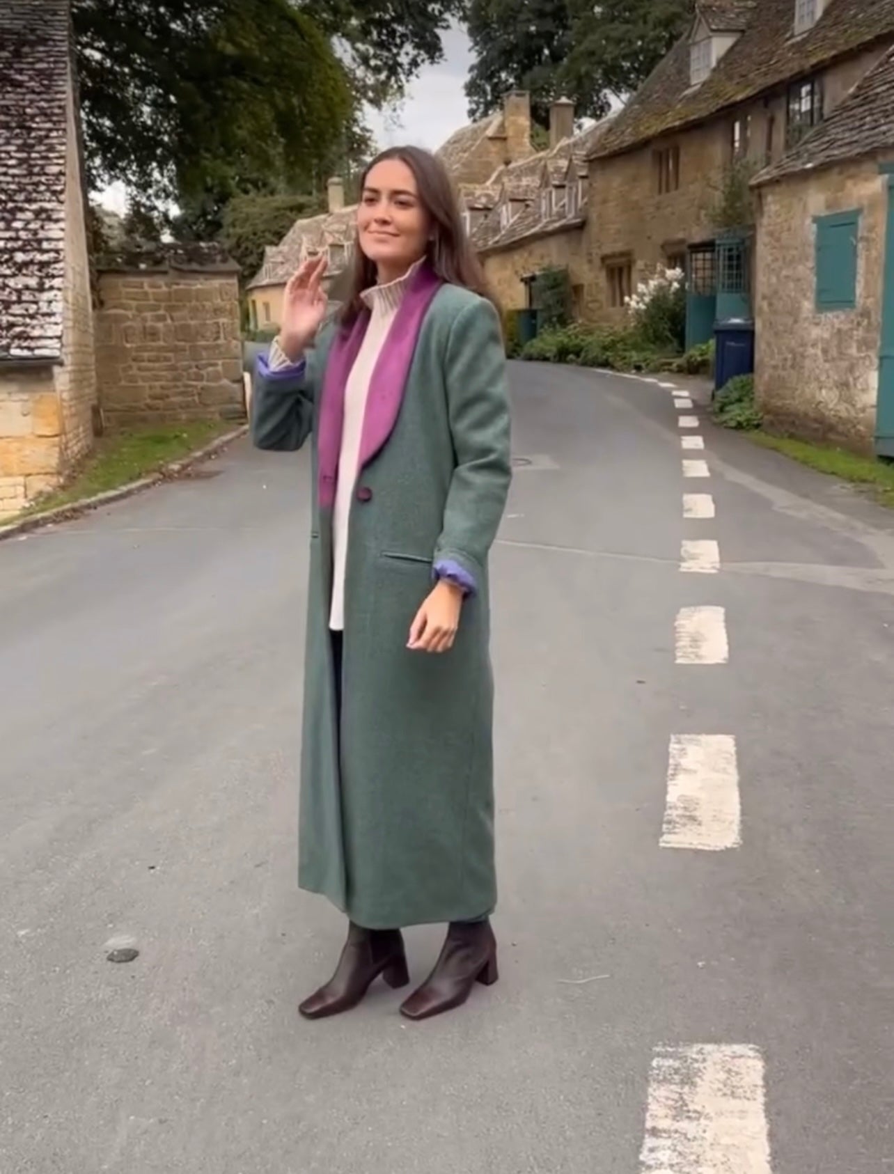 Abrigo de corte recto y largo con solapas haciendo contraste y un solo botón.