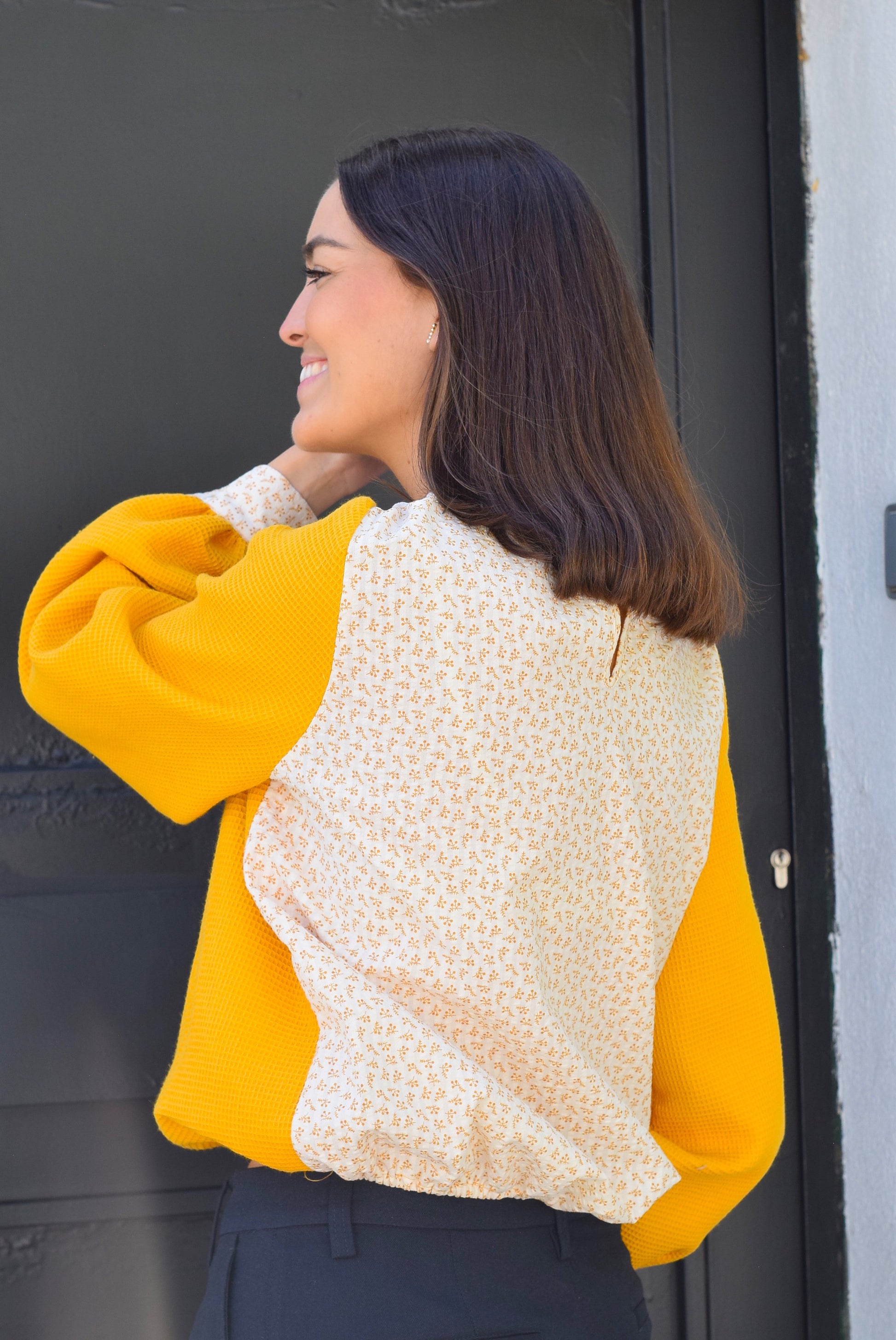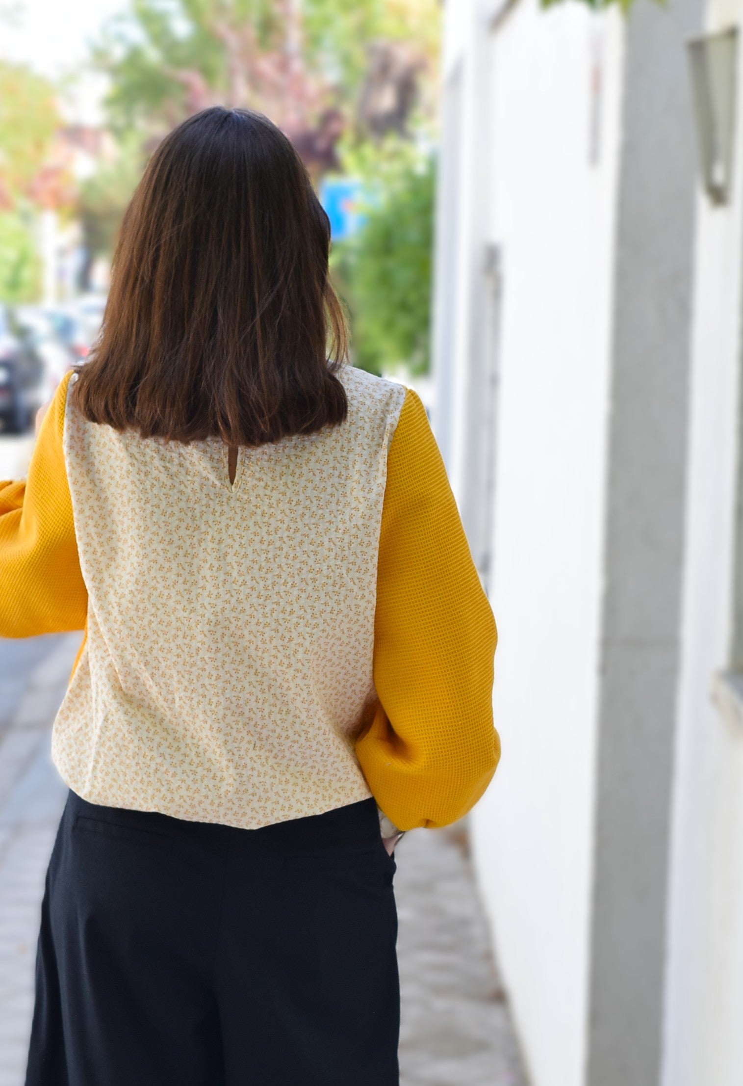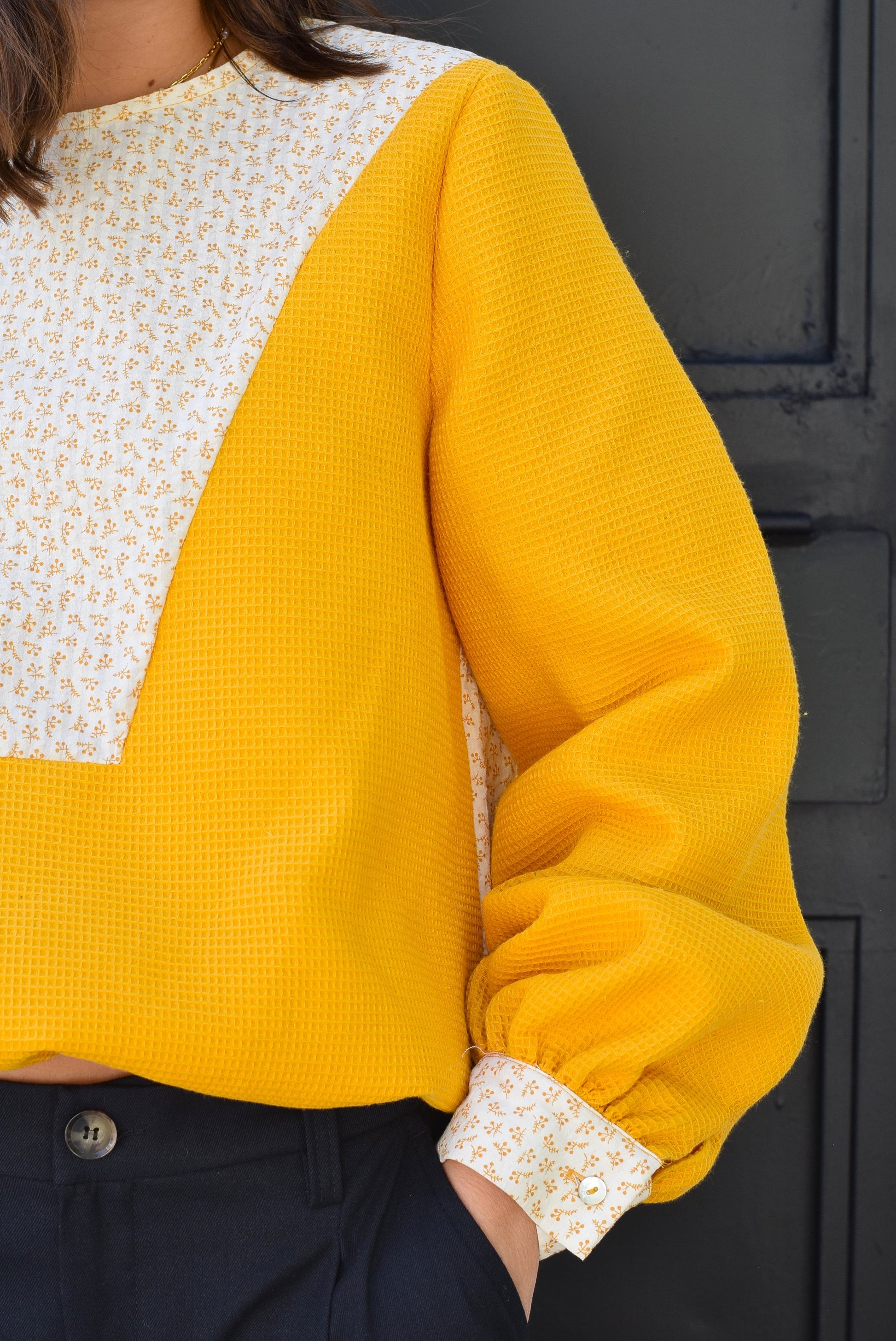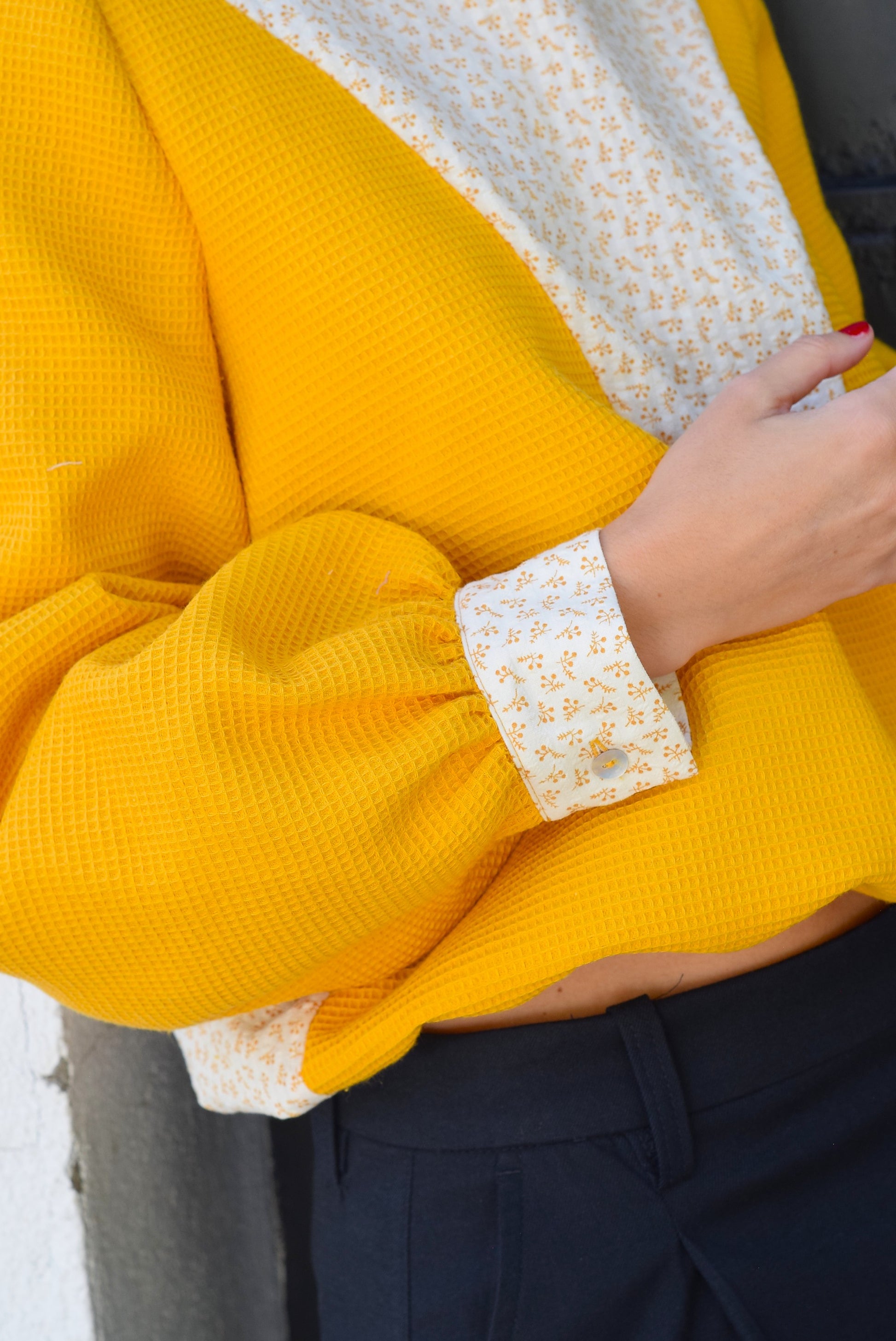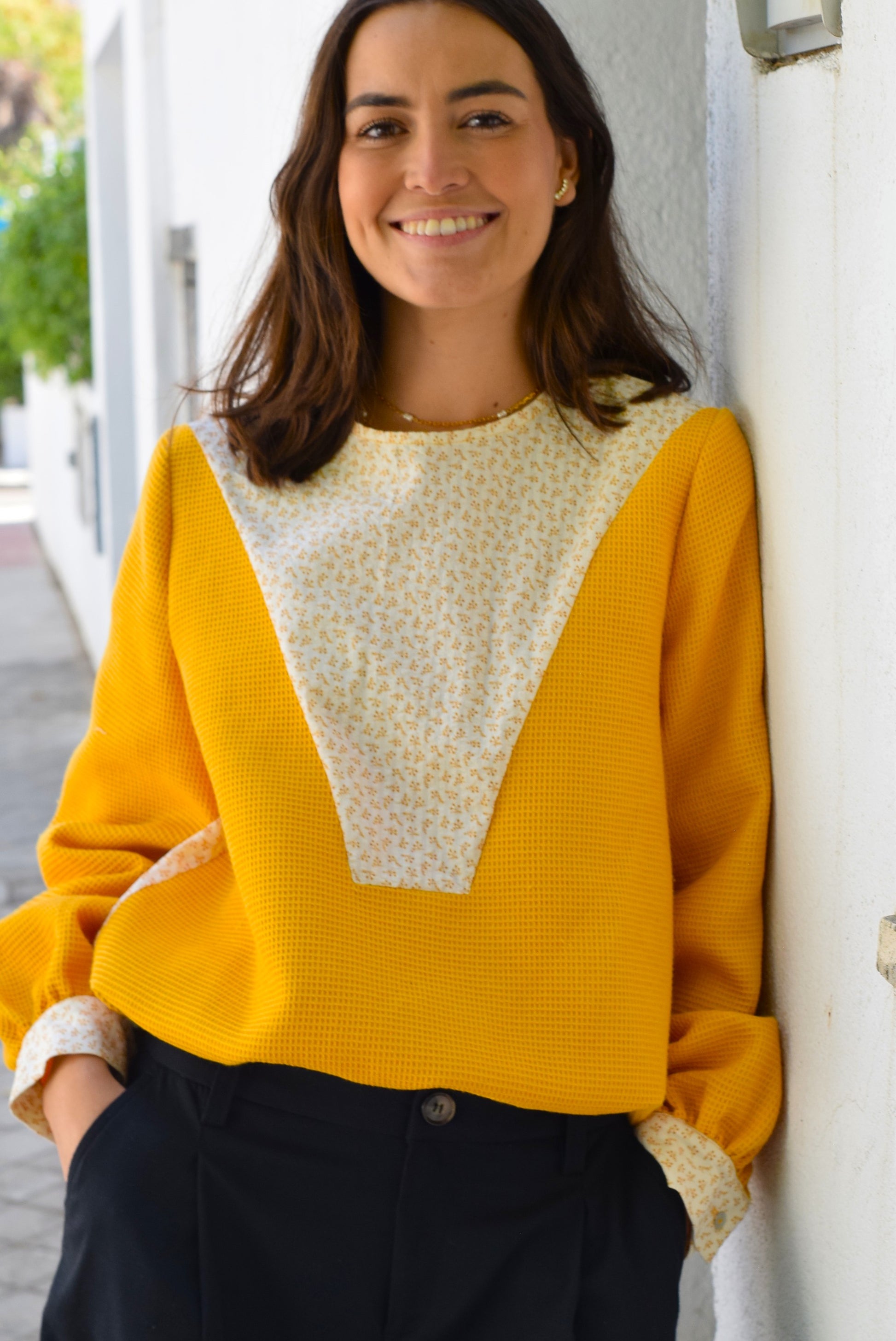 Blusa bicolor. Cuello redondo. Puños de botón en otro color. Delante bicolor y espalda en el color de la perchara. Acabada en goma para hacer efecto. Una blusa original y diferente que te alegrará cualquier look.