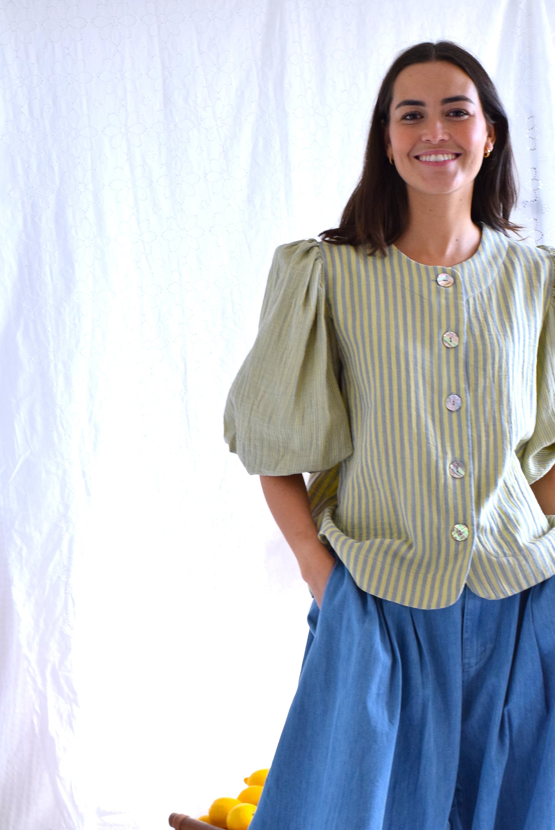 Blusa con botones de nacar y manga abullonada corta, combinando rayas mas finas en la manga con rayas mas anchas. Perfecta para un look informal o un look más de vestir. También queda muy bonita como chaqueta abierta.