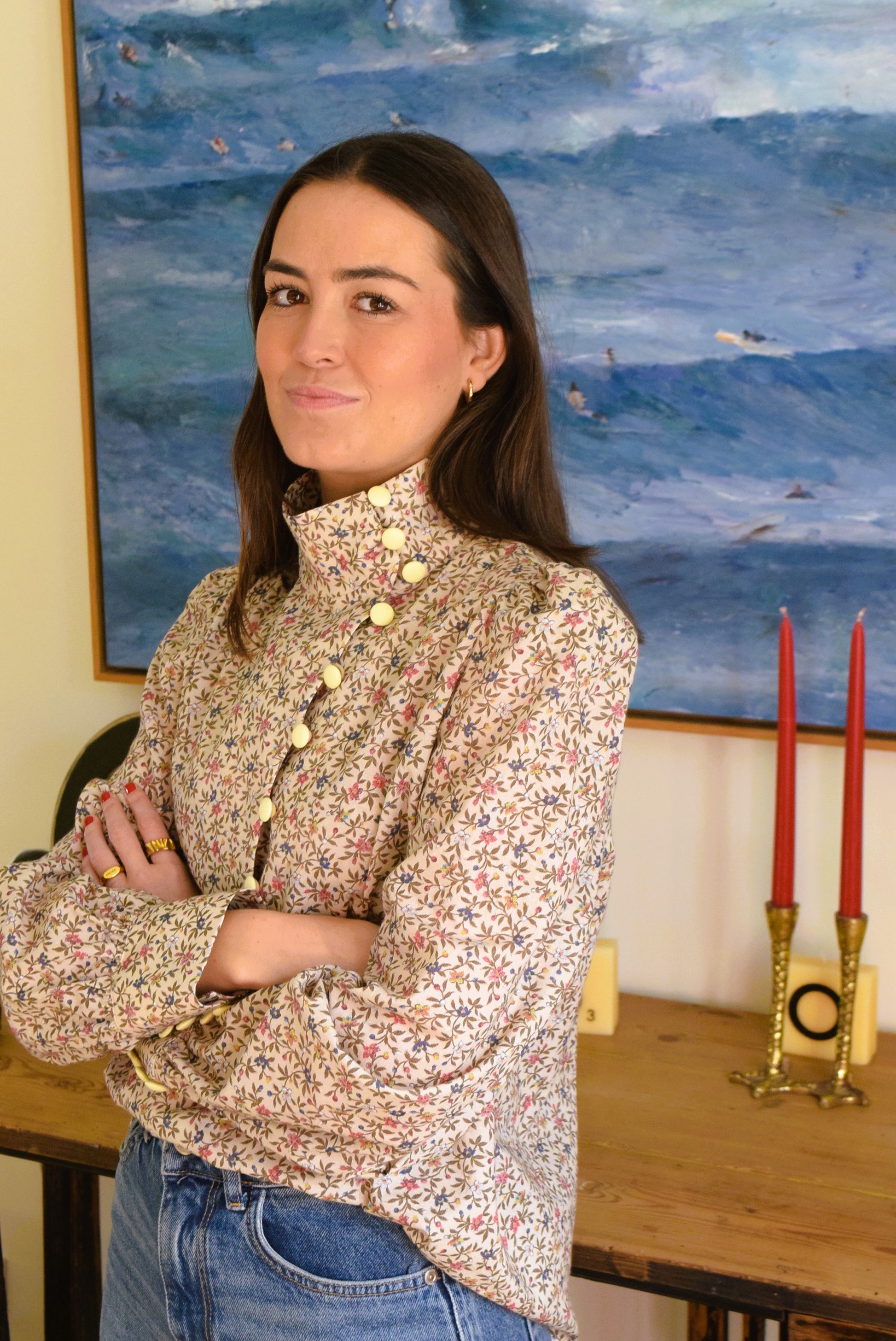 Blusa con cuello alto y minibotones forrados que bajan en diagonal.