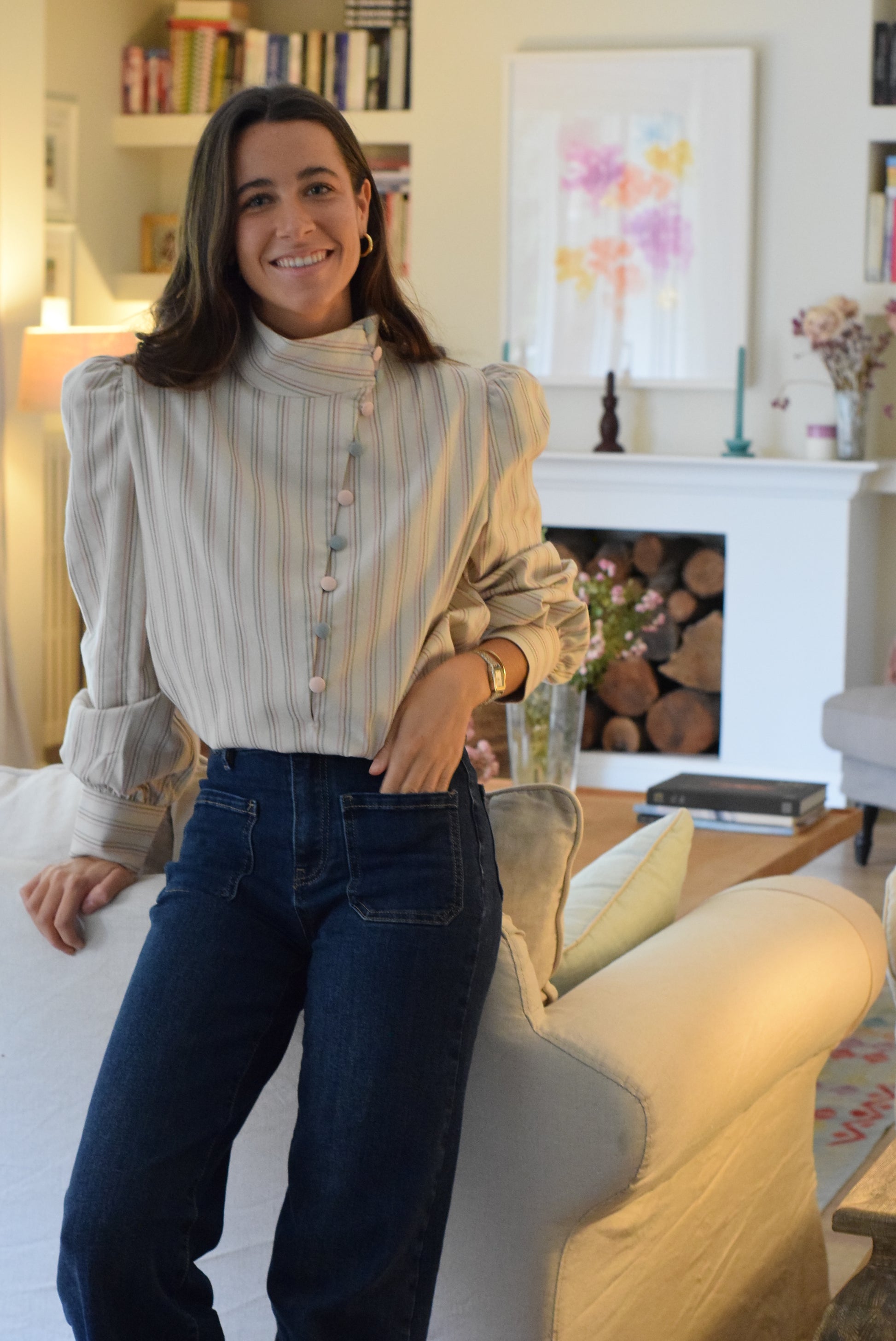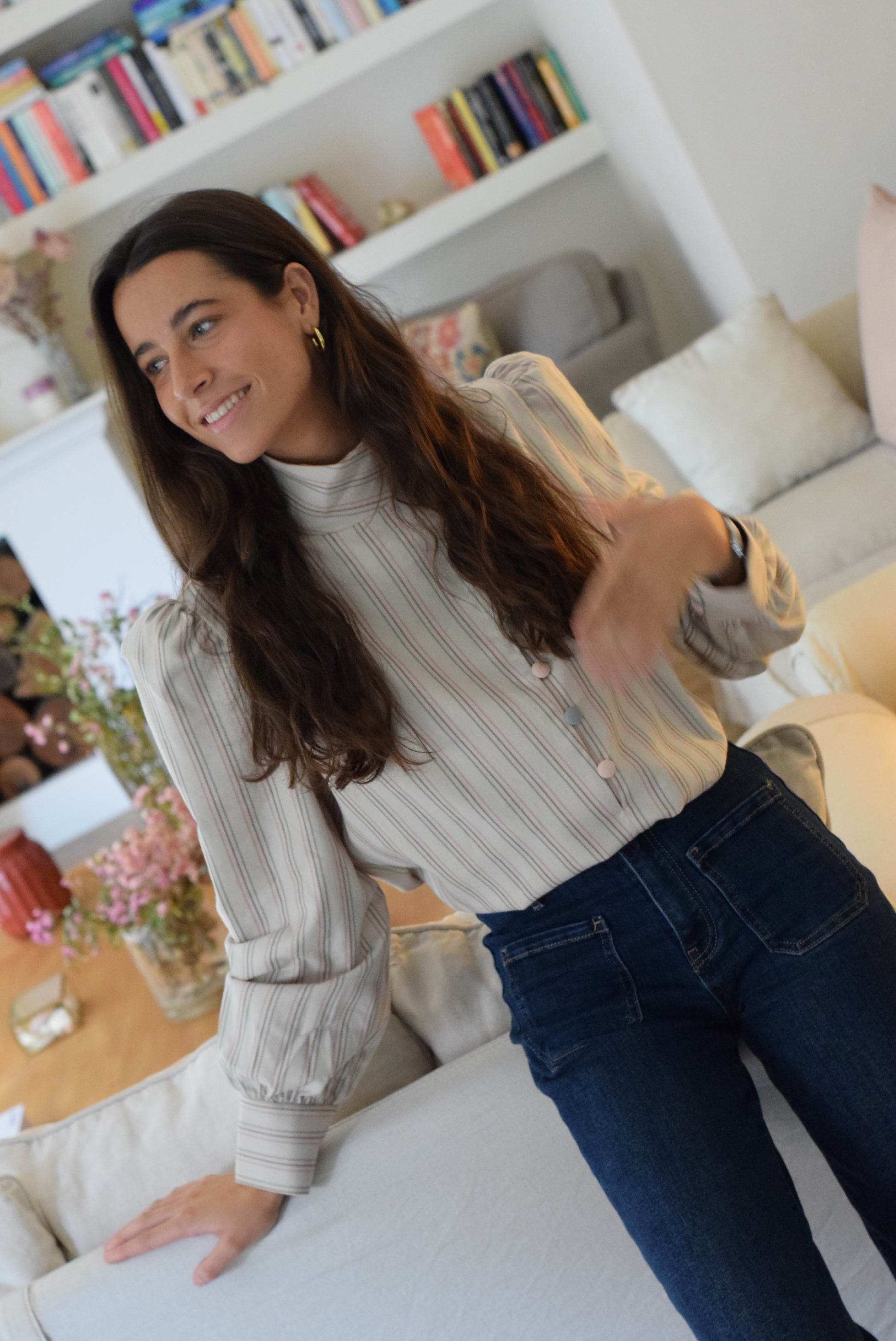 Blusa con cuello alto y minibotones forrados que bajan en diagonal.