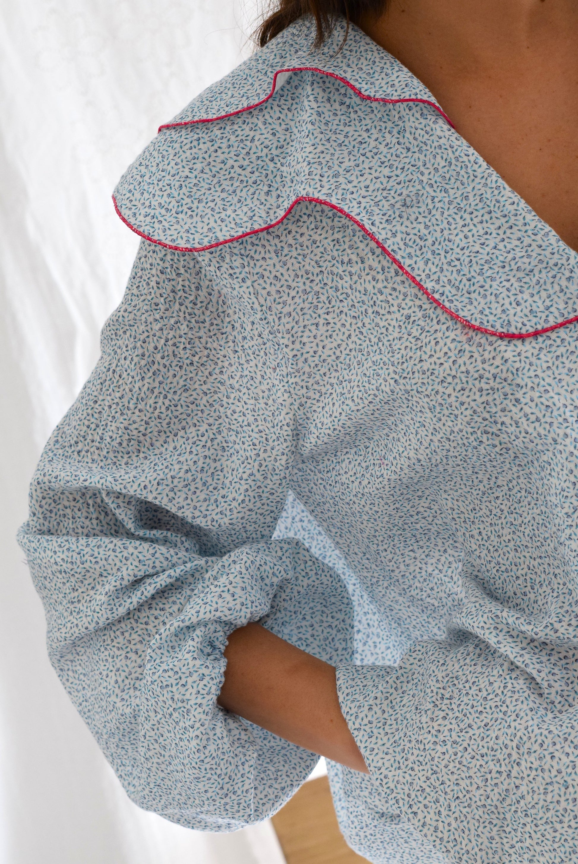 Blusa con escote en pico y doble cuello tipo bobo.