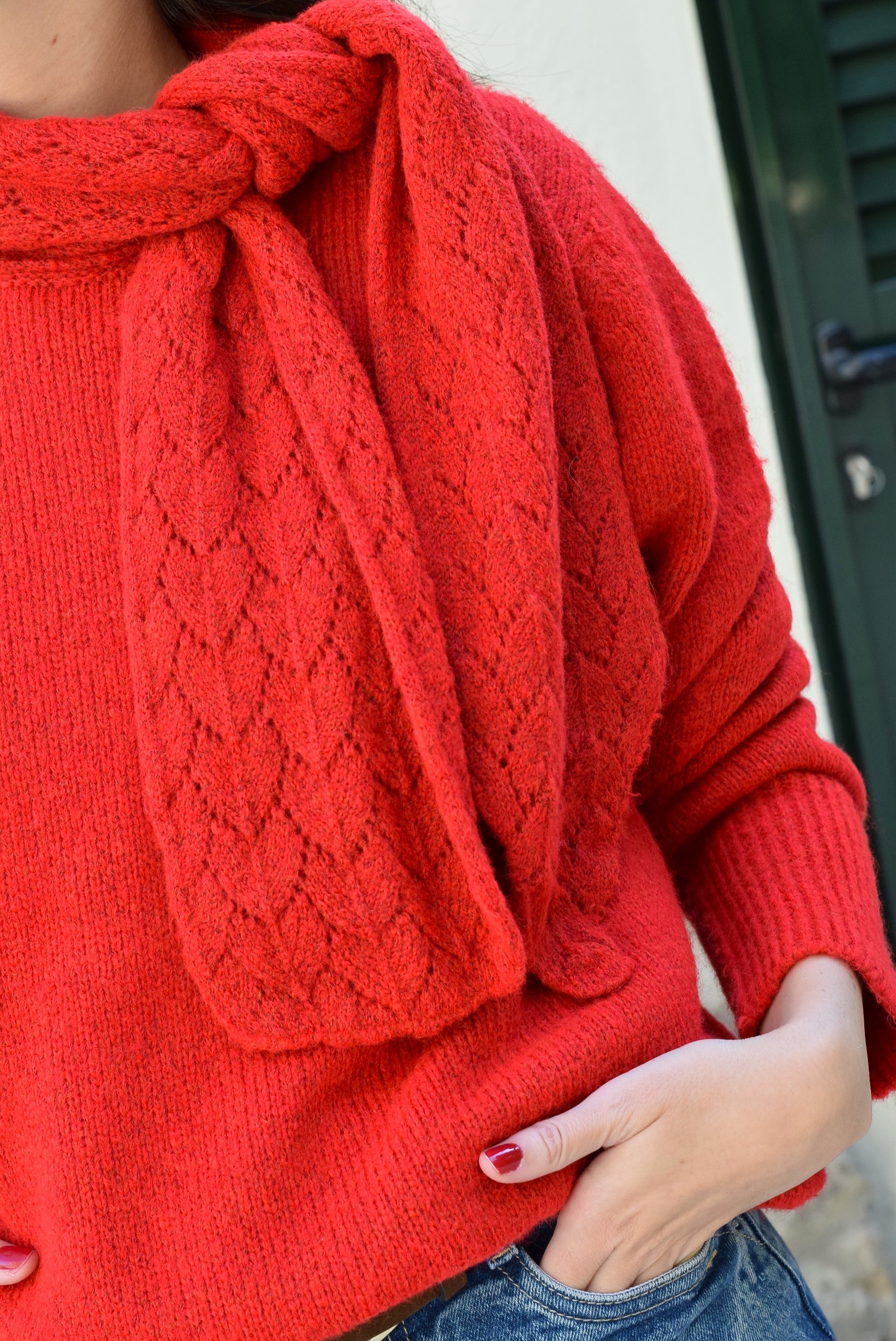 Jersey con cuello cerrado y lazada con calados. Posiblidad de hacer lazo en el cuelo o dejarlo suelto como una lazada caída. Un bonito y original jersey que te hará sentir muy estilosa.