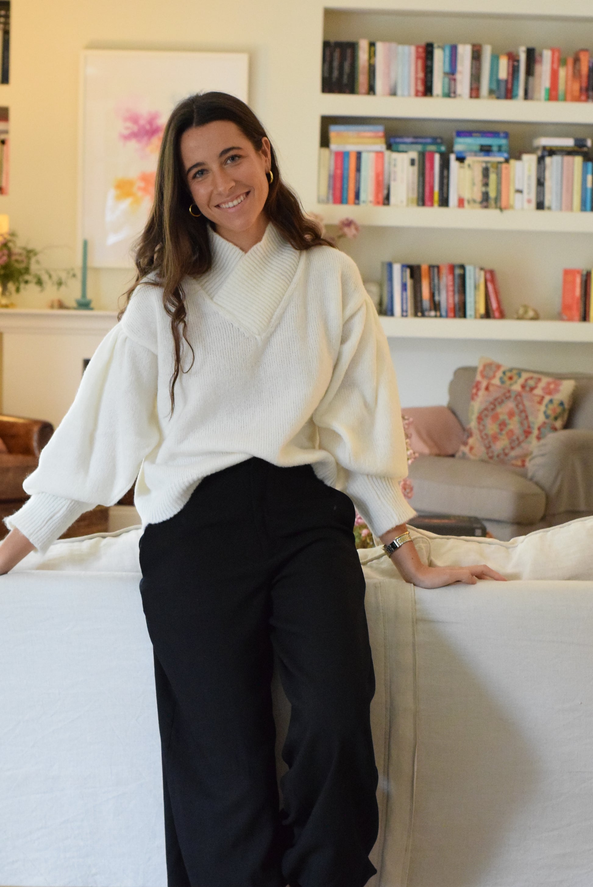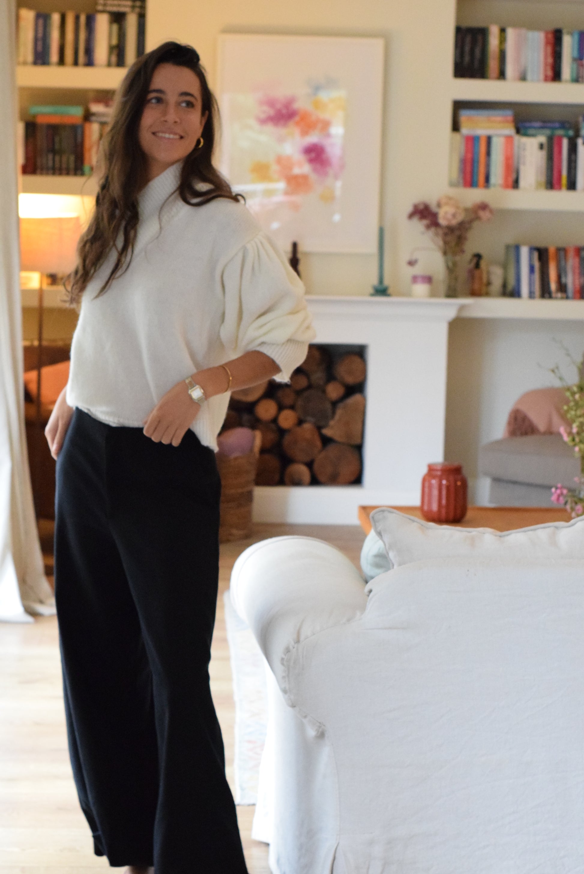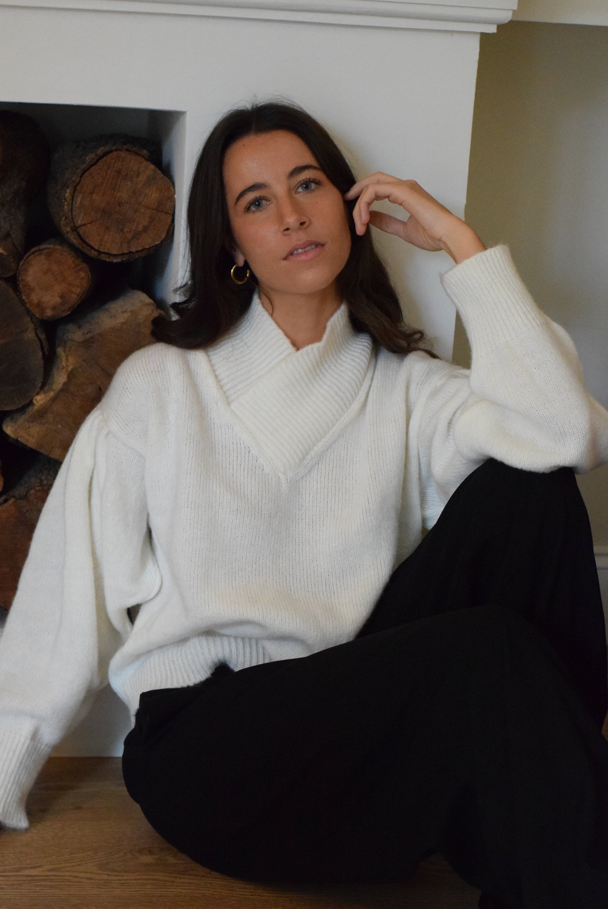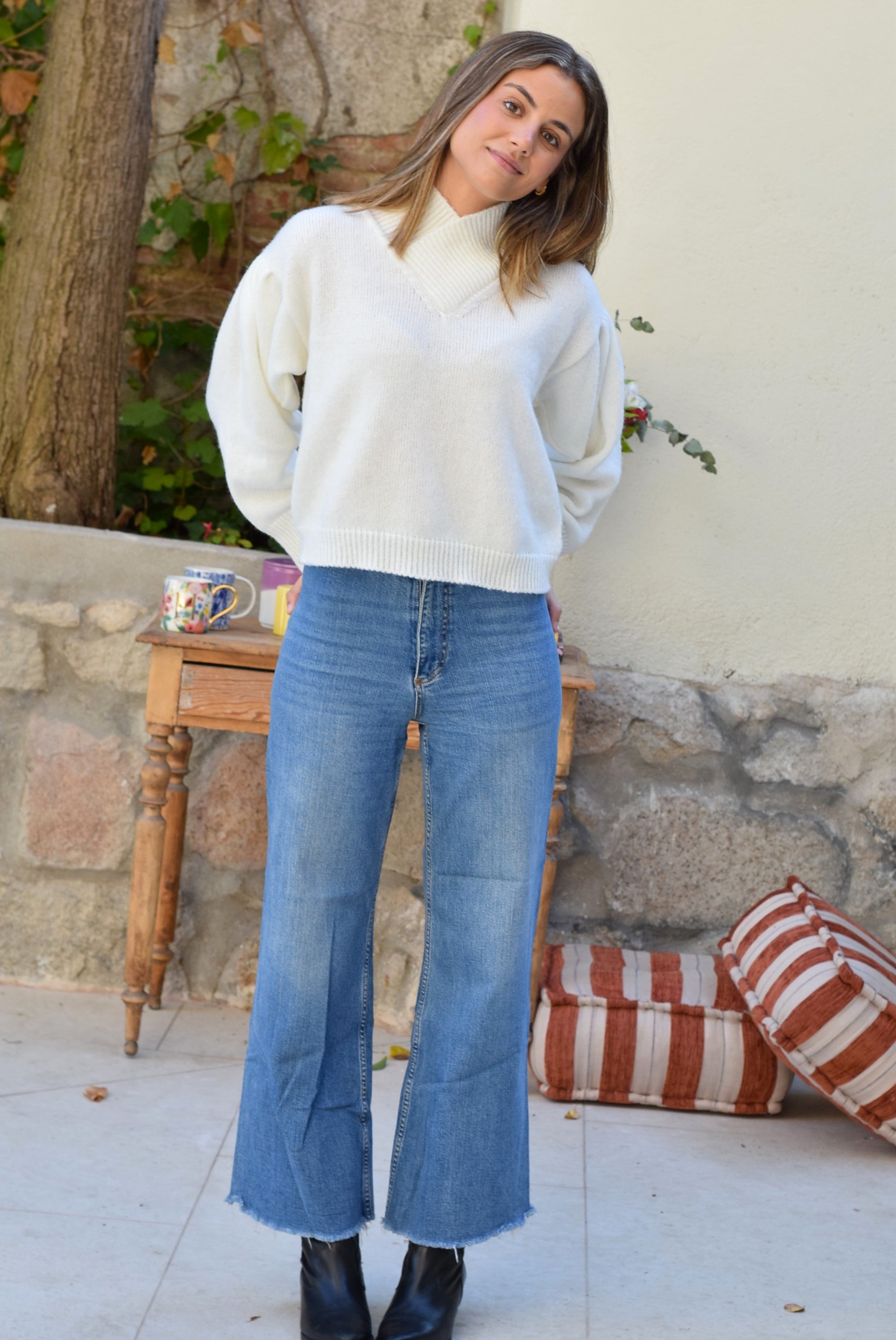 Jersey con cuello subido y cruzado estilizando mucho esa parte del cuello. Manga abullonada con pliegues en el corte bajo el hombro y calado en los puños. Un bonito y original jersey que te hará sentir muy estilosa.