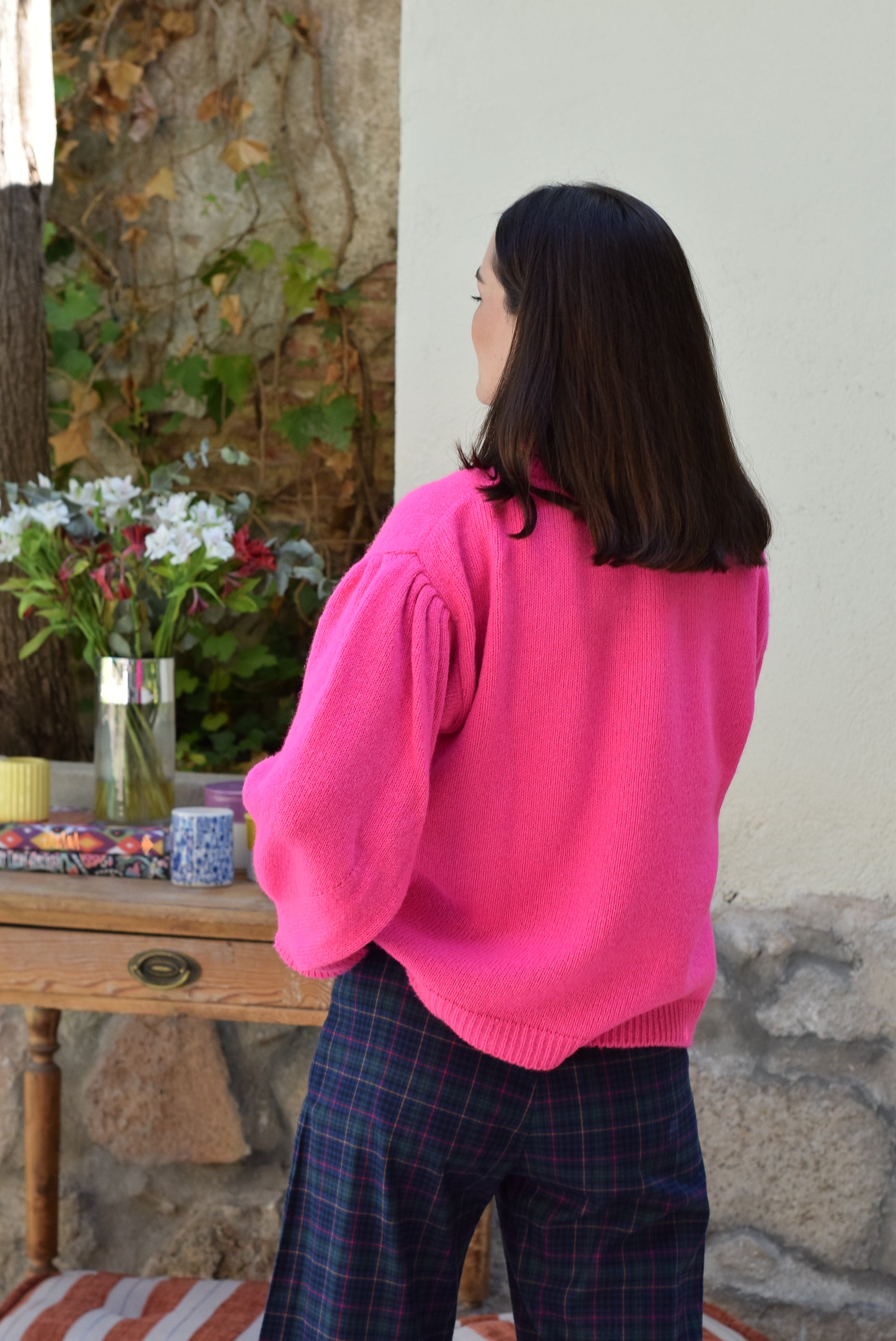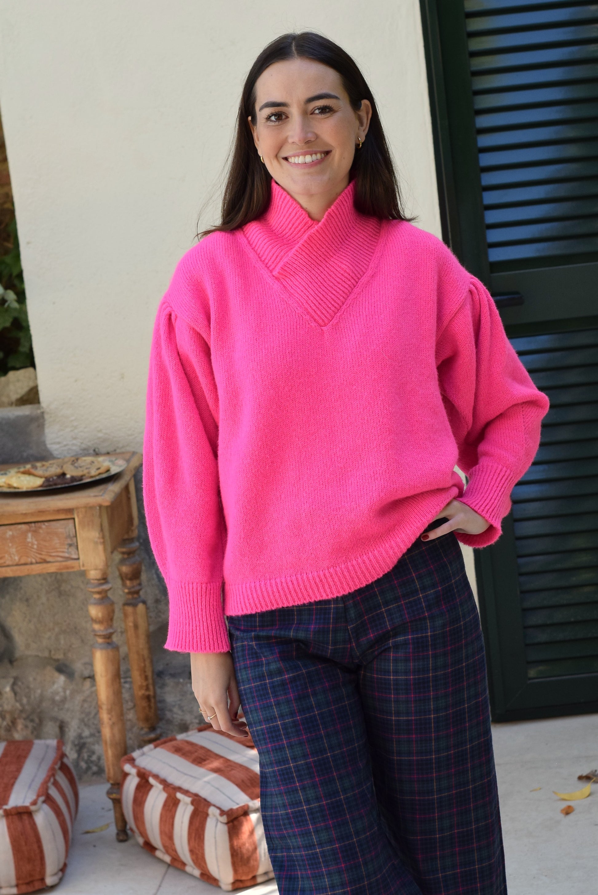 Jersey con cuello subido y cruzado estilizando mucho esa parte del cuello. Manga abullonada con pliegues en el corte bajo el hombro y calado en los puños. Un bonito y original jersey que te hará sentir muy estilosa.