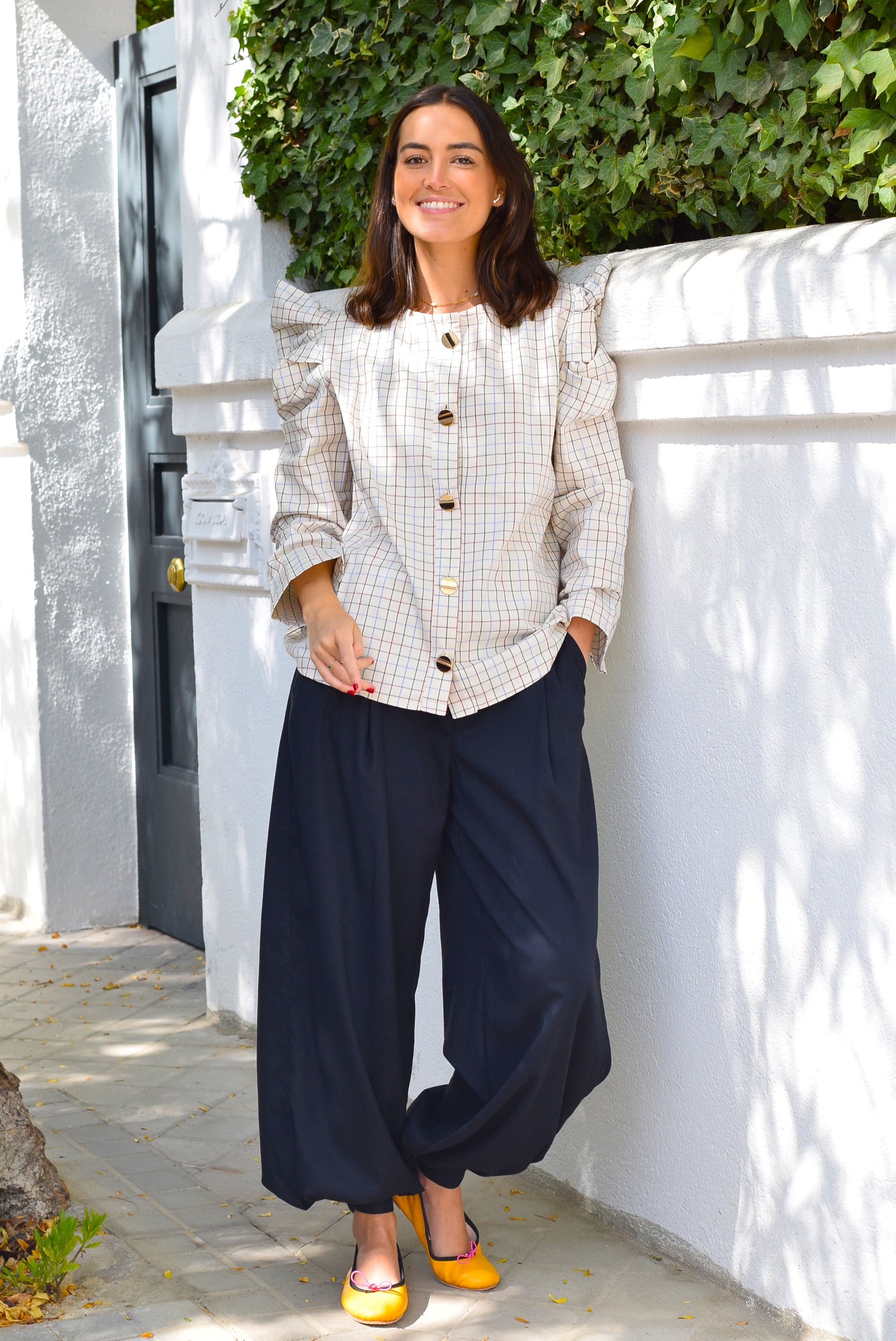 Sobrecamisa con hombros subidos haciendo picos. Ideal para llevar abierta encima de otra prenda o cerrada sin nada debajo. Botones dorados