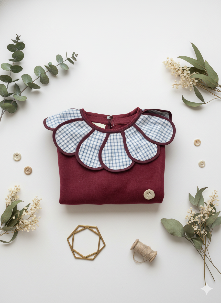 Sudadera de algodón granate con cuello vichy malva. Un diseño exclusivo de Maquís and Co a juego de las sudaderas Kids.