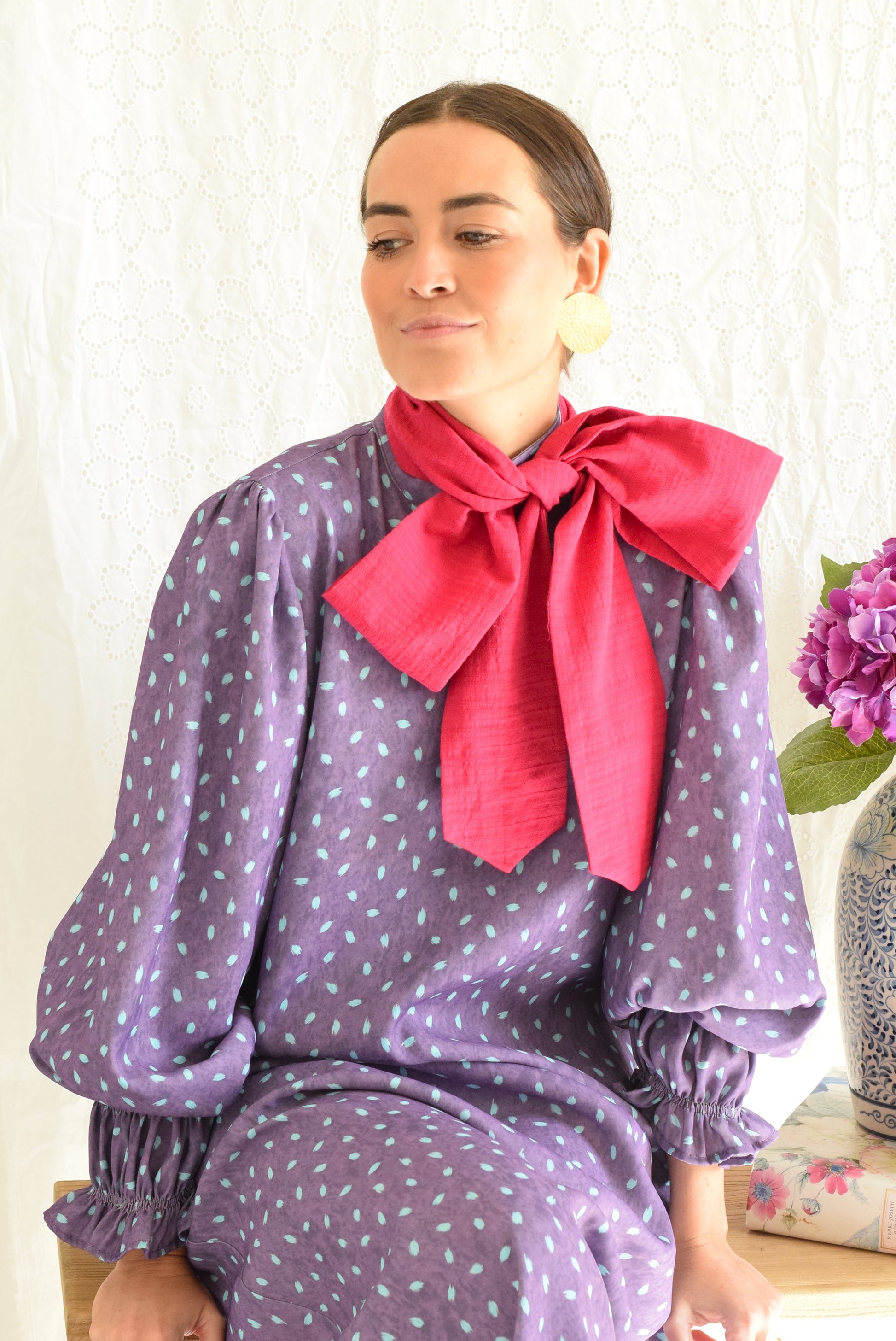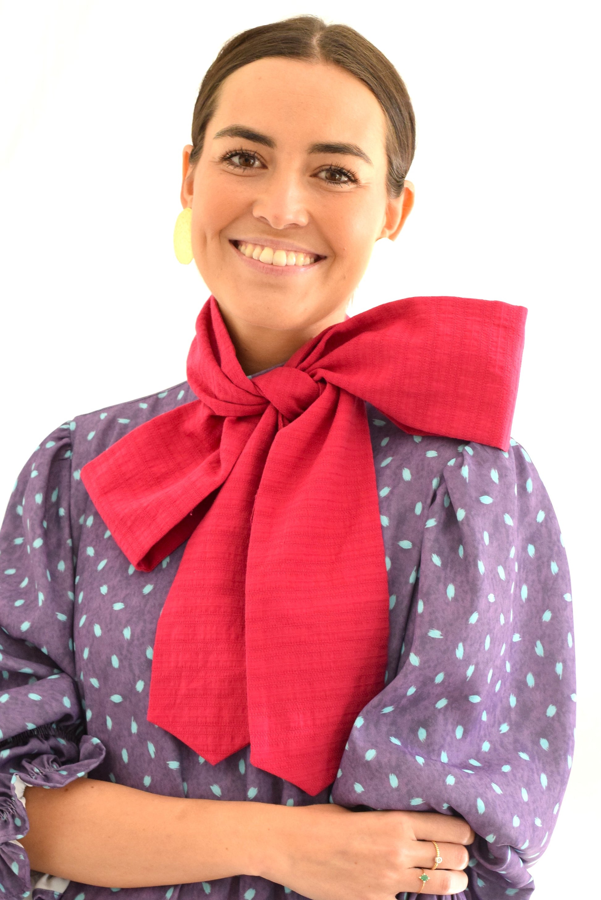 Vestido cuello alto y con un gran lazo en el cuello con diferentes posibilidades. Puedes anudarlo en la espalda y dejarlo caer, puedes anudarlo por delante y dejarlo caer o puedes hacer un bonito lazo en el centro del cuello.